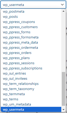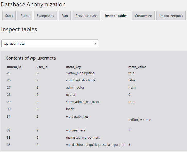 Click on Inspect tables to view the current data stored in the WordPress database. This screen supports two activities: