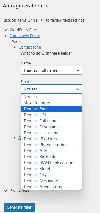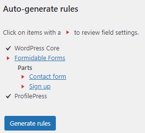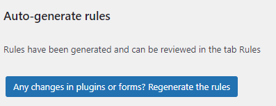 A red triangle indicates that user guidance is needed to generate the rules. In the example, this is the case for Formidable Forms. If you click on the plugin name, the screen will expand.