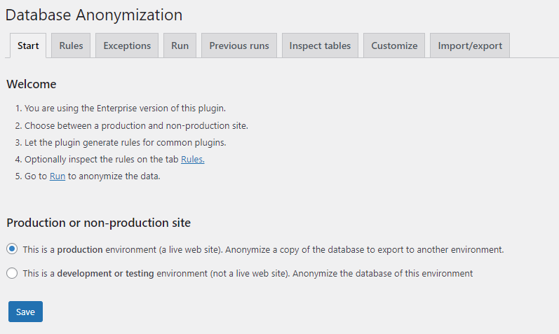 For production sites, the plugin will create an anonymized database export file while leaving the real data in the live database untouched.
